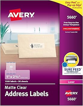 Avery Laser Address Labels, Sure Feed Technology, 1" x 2 5/8", Matte ... These address labels make your most important messages stand out Individual labels measure 1"H x 2 5/8"W Clear labels virtually disappear on white, light-colored, and textured surfaces $66.99 1500/box $0.04/Label Delivered FREE in 1-2 business days Order within 15 hrs 21 mins 1-Hour pick up Free Returns Add to cart