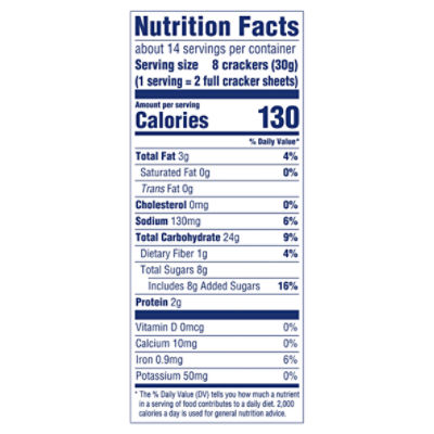 Nutrition Facts for Honey Maid Honey Graham Crackers Honey Maid Honey Graham Crackers Nutrition Facts Serving Size sheets 2 sheets = 31g Amount Per Serving 130 Calories % Daily Value* 5% Total Fat 3g 0% Saturated Fat 0g Trans Fat 0g 0% Cholesterol 0mg 7% Sodium 160mg 8% Total Carbohydrate 24g 4% Dietary Fiber 1g Total Sugars 8g 16% Includes 8g Added Sugars Protein 2g 0% Vitamin D 0mcg 1% Calcium 13mg