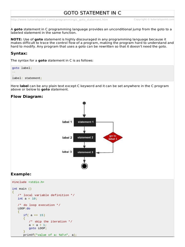 Statements - cppreference.com A label with an identifier declared inside a function matches all goto statements with the same identifier in that function, in all nested blocks, before and after its own declaration. Two labels in a function must not have the same identifier. C++ goto statement - tutorialspoint.com NOTE − Use of goto statement is highly discouraged because it makes difficult to trace the control flow of a program, making the program hard to understand and hard to modify. Any program that uses a goto can be rewritten so that it doesn't need the goto. Syntax. The syntax of a goto statement in C++ is −. goto label; .. . label: statement;