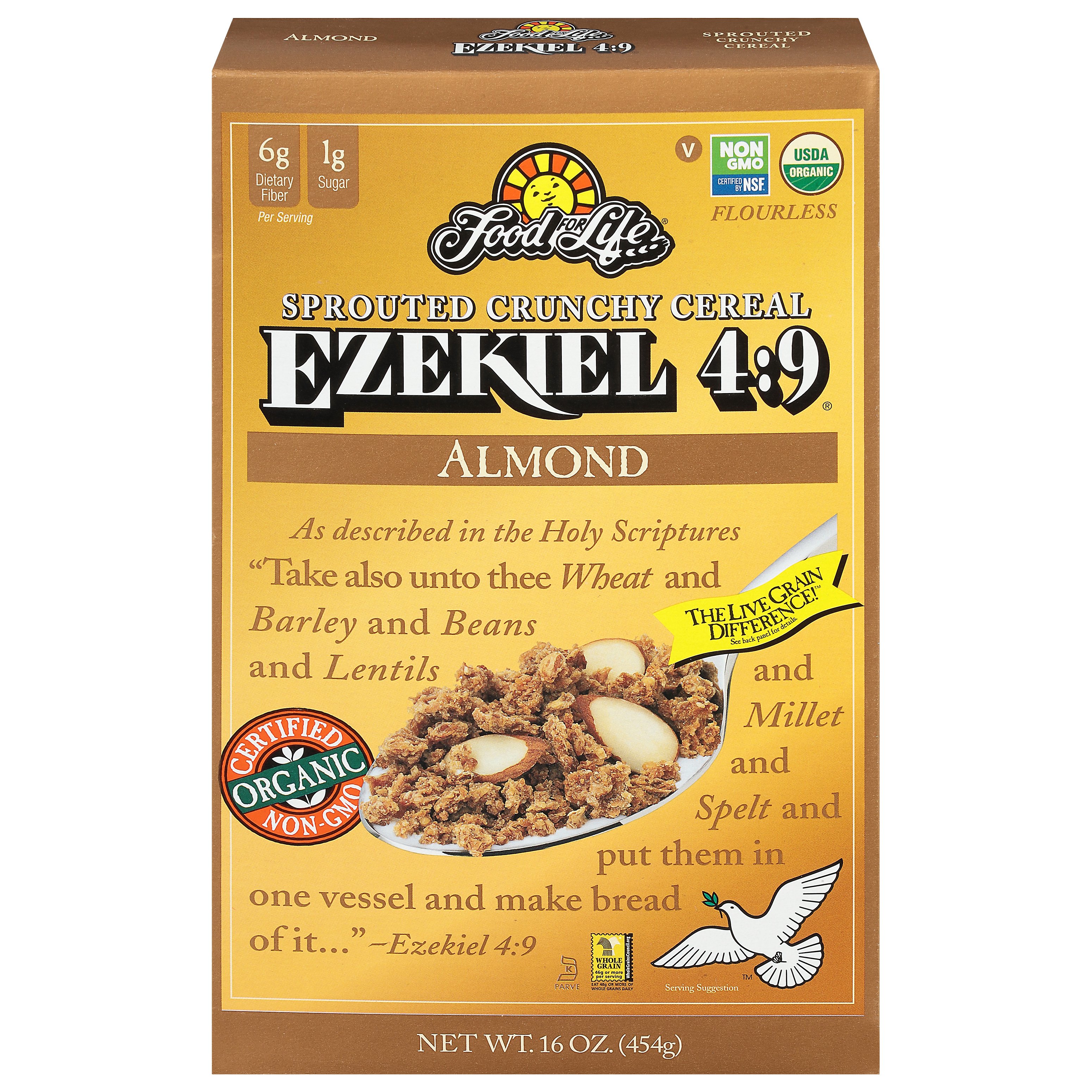 The 23 Best Vegan Cereal Brands We've Tried Food For Life Sprouted Whole Grain Almond Cereal. This cereal brand was inspired by the biblical verse, Ezekiel 4:9, which states "take also unto thee wheat and barley and beans and lentils." These ingredients make up the base of this nutrient packed cereal. Organic almonds add an extra level of flavor and health benefits. The ingredients list ...
