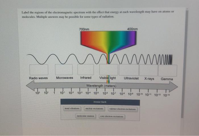 PDF The Electromagnetic Spectrum - tumwater.k12.wa.us 8. Fill in the blanks underneath the wave spectrum to indicate the relative positions of each type of electromagnetic radiation from the given word bank. 9. Look carefully at the electromagnetic spectrum shown below paying attention to the wavelengths and frequencies indicated. The visible portion of the electromagnetic spectrum has been enlarged