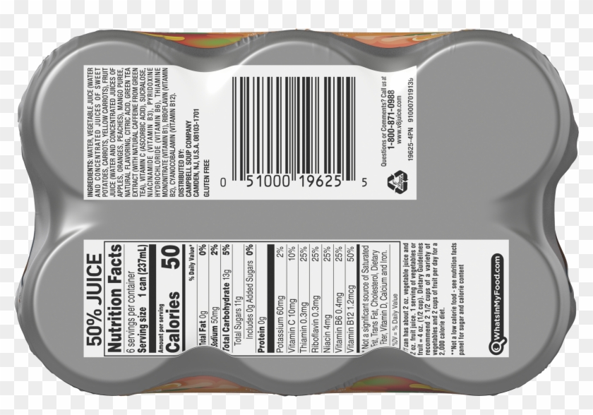 CAMPBELL Soup Company, V8 V. FUSION Juices, Peach Mango Nutrition Facts ... CAMPBELL Soup Company, V8 V. FUSION Juices, Peach Mango Nutrition Facts & Calories For best results, be sure to enable the option to PRINT BACKGROUND IMAGES in the following browsers: - Firefox ( File > Page Setup > Format & Options ) - Internet Explorer 6/7 ( Tools > Internet Options > Advanced > Printing ) - In Internet Explorer 7 you will ... V8 Fusion Nutrition Facts Label - V8 Energy Pomegranate Blueberry ... Nutrition facts label for campbell soup company, v8 v. Fusion juices ( campbell soup company, peach mango). 2,000 calories a day is used for... Home - V8® Fruit and Vegetable Juices For screen reader problems with this website, please call 1-844-995-5545.