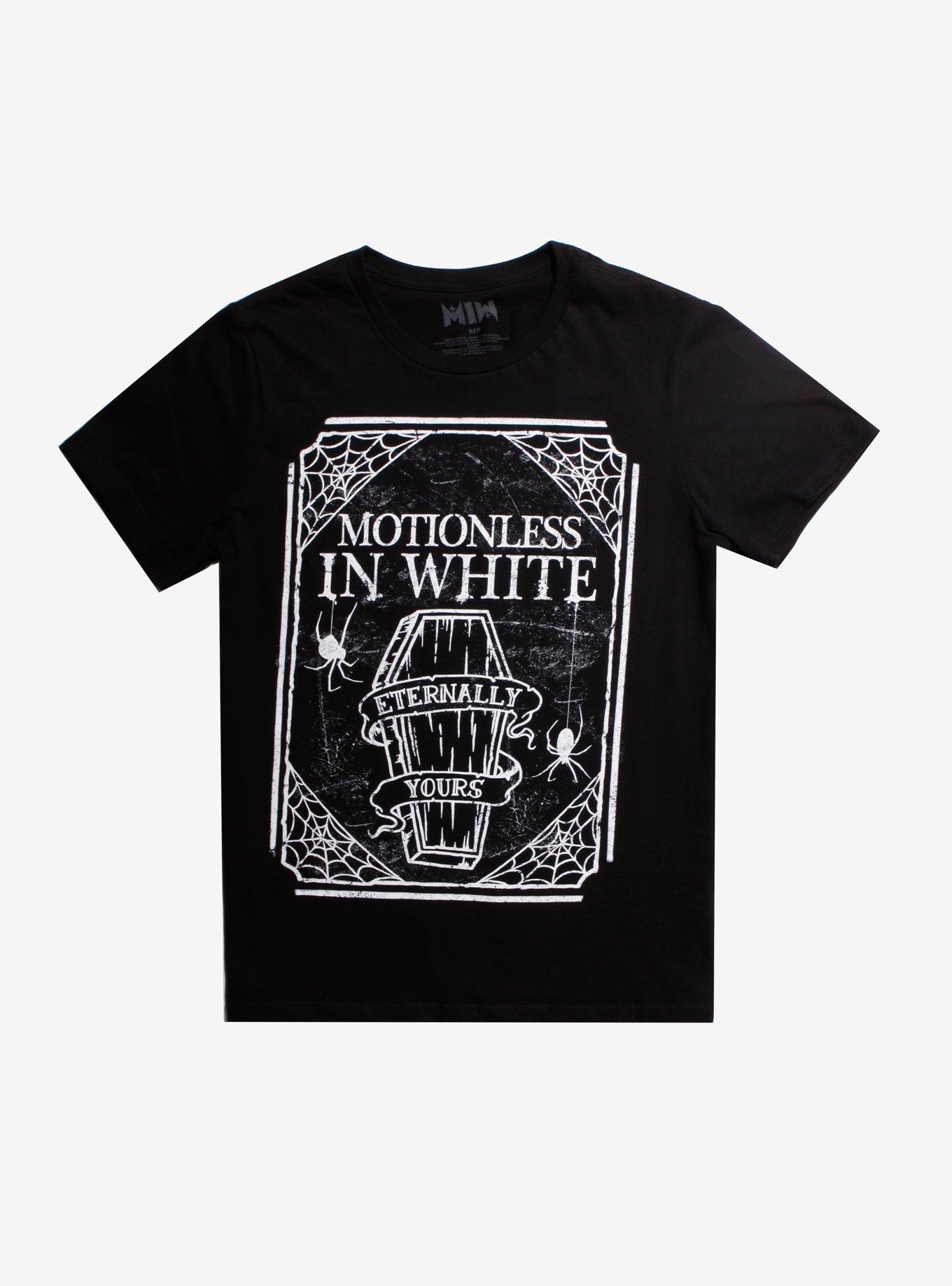 Motionless In White Merch - T-Shirts & Hoodies - Rockabilia Motionless in White, often abbreviated MIW, is an American metalcore band from Scranton, Pennsylvania. Formed in 2005. Members include; Chris "Motionless" Cerulli, Ryan Sitkowski, Ricky "Horror" Olson, Devin "Ghost" Sola, Vinny Mauro, Kyle White, Mike Costanza, Frank Polumbo, Thomas "TJ" Bell, Angelo Parente, Brandon "Rage" Richter, Josh Balz.